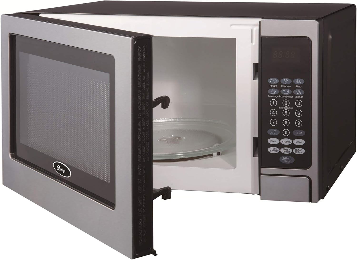 अगाडि view of the Oster OGZD0701 Microwave Oven with the door open, showing the interior cavity and control panel.