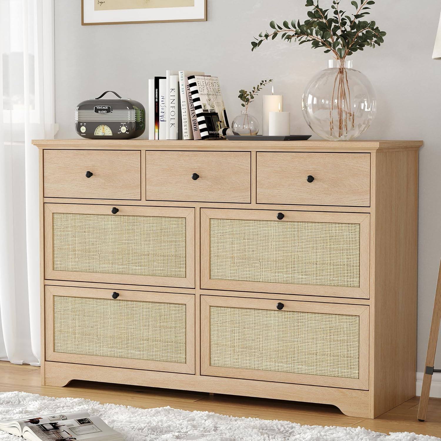 चित्र १: ब्राफाब रैटन ड्रेसर (मोडेल QH-1501NL) मा सातवटा दराज र रैटन प्यानलहरू सहितको प्राकृतिक काठको फिनिश छ।