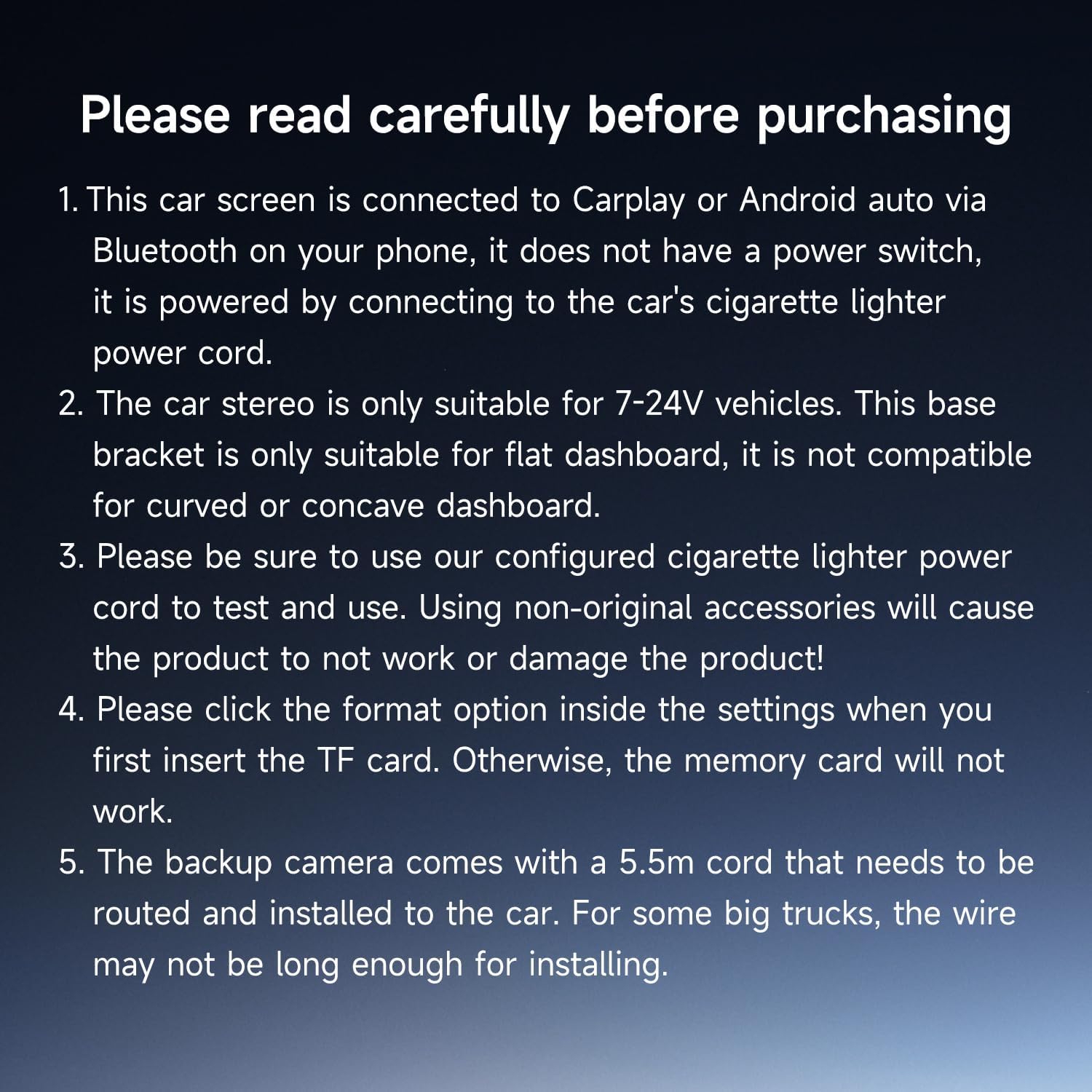- The car stereo is suitable for 7-24V vehicles only. The included base bracket is designed for flat dashboards and is not compatible with semi-circular, curved, or concave dashboards.